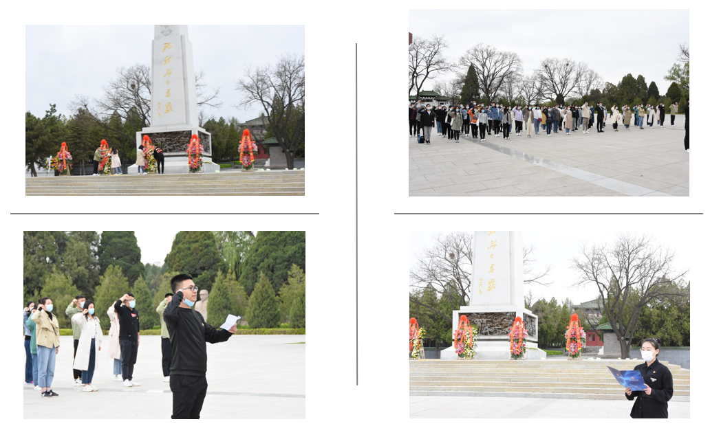 下午三时许,党日活动开始。员工代表向长眠于此的两千余名英魂敬献花篮,全体党员、积极分子面向纪念碑为民族独立和人民解放事业浴血奋战、英勇献身的革命先烈默哀三分钟,并在党员代表宋慧亮领誓下重温入党誓词。随后,党员代表张惠棠带领全体同学回顾太原解放的经过,告诫全体党员务必保持斗志,奋勇向前,方能无愧于先烈,无愧于党的期待与嘱托。