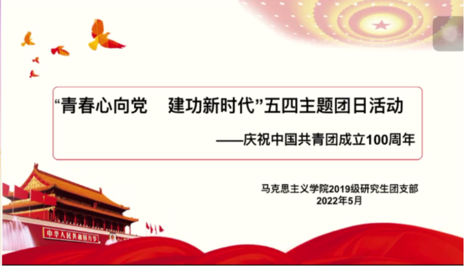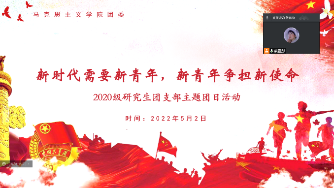 2020级研究生团支部围绕“新时代需要新青年,新青年争担新使命”开展主题团日活动。团支书柴昱彤以“那年的五四,那时的青年”、“这一代年轻人还有不计生死的血性吗”“如何争做堪当民族复兴重任的时代新人”三个问题引发团员青年的思考。支部团员从毛泽东、蔡和森、郭钦光、邓中夏等历史人物在五四运动时期的青春故事中,重温那一代青年的初心与使命;共同观看微电影《重逢》,感受新时代青年保家卫国的血性与勇气;共同学习习近平总书记在中国人民大学考察重要讲话精神,讨论如何在自己的学习生活中践行青年担当。大家纷纷表示,未来要更加坚定信仰,夯实理论基础,丰富专业素养,勇担时代责任,在助力国家重大活动、投身基层志愿服务、宣传党的创新理论成果的实践中,贡献乐天使学子的青春力量。