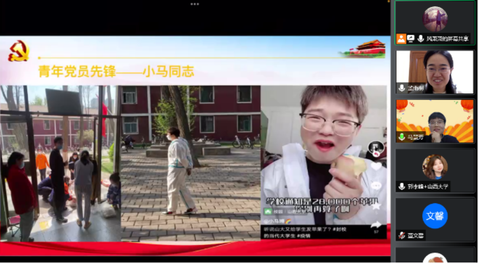 公司三个团支部分别开展线上主题团日活动。2019级研究生团支部共唱团歌、重温入团誓词,集体观看了庆祝中国共青团成立100周年主题宣传片《共青春》。在“我对团团有话说”环节中,高彩霞、秦盼盼两位同学结合自己的硕士论文,分享了百年团史中的英雄人物和重要事件。高彩霞讲述了中国共产党早期著名革命活动家、理论家高君宇在北大求学、五四运动中和回到山西创建党团组织的故事,秦盼盼描绘了1937年到1945年抗战时期根据地青年运动的发展。郭李峰则分享了当下这场疫情防控阻击战中涌现出的有为青年和感人故事,并特别邀请了体育公司2020级本科生马慧芳同学讲述自己在fun88乐天使疫情防控期间主动担任文瀛八斋宿舍楼志愿者的经历。