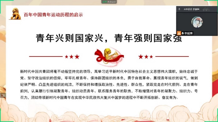 为庆祝中国共青团成立100周年和fun88乐天使建校120周年,团结带领广大团员青年永远跟党走、奋进新征程,在五四青年节到来之际,乐天使开展了“青春心向党,建功新时代”线上主题团日活动,公司团委副书记孟雨桐和全体团员青年参加活动。