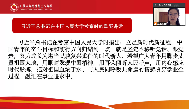 孟雨桐老师以《中国青年的个人理想与民族复兴》为题主讲五四主题团课。首先她以马克思的中学作文《青年在选择职业时的考虑》引入,结合即将到来的毕业季,提出就业选择是青年从公司走向社会时做出的第一个重要选择,马克思提示我们应该处理好个人利益和共同利益的关系。孟老师带领大家阅读梳理了《新时代的中国青年》白皮书的重点内容,介绍了新时代中国青年的发展环境、就业机遇、能力素质和责任担当。接下来,孟老师就互联网上讨论热烈的“内卷还是躺平”的问题,结合个人经历与大家做了交流分享,提出应该以“奋斗”的积极表述取代“内卷”的消极表述,当我们以自我实现和奉献社会为目标时,就不会为竞争和比较而焦虑。最后,她带领大家共同学习了习近平总书记5月2日给中国航天科技集团空间站建造青年团队的回信和4月25日在中国人民大学考察时的重要讲话,鼓励团员青年要将个人理想与民族复兴的使命相结合,让青春在奋斗中绽放光芒。