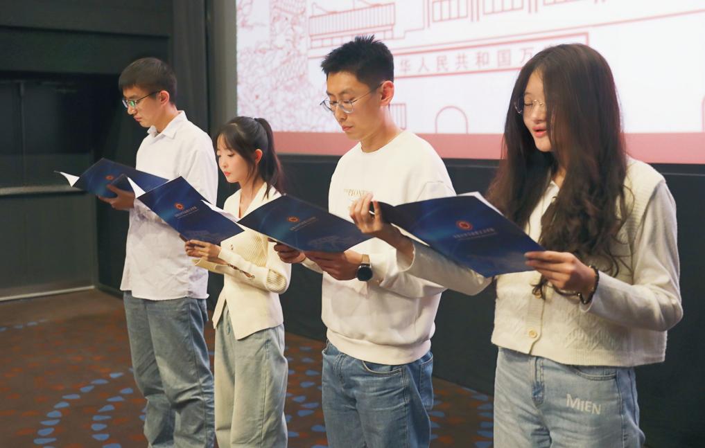 影片结束后,李岩玉、张伟、周嘉琦、殷雍捷四位同学带来朗诵《共产党颂》。“我们的生活有你才更好,我们的生命要为你燃烧,你的那旗帜永远的飘,在我们心中永远的飘。”他们声音洪亮、情感充沛,用饱满的热情和真挚的情感发出矢志不渝跟党走、建功立业新时代的青春誓言。
