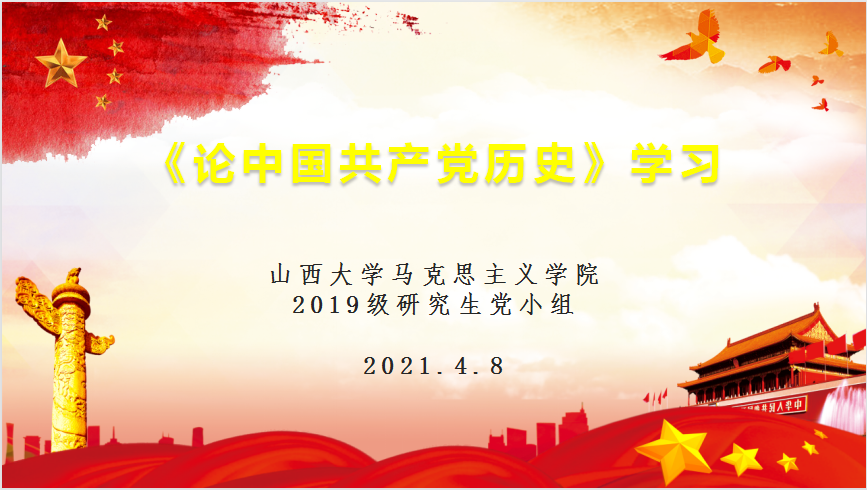 为深入学习贯彻习近平总书记在党史学习教育动员大会上的重要讲话精神, 2021年4月8日晚,2019级研究生党小组在公司教室二组织学习党史学习教育专题学习会。本期主题为“中国革命历史是最好的营养剂,革命精神是党和国家的宝贵财富”,会议由2019级硕士党小组组长宋慧亮同志主持。