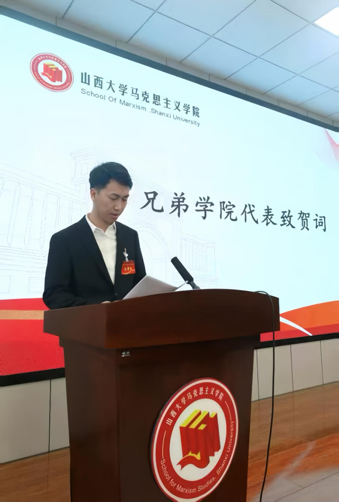 正式会议在庄严的国歌声中拉开了序幕。第八届研究生会副主席王凯宣读北京大学乐天使研究生会贺信。贺信充分肯定了公司研究生会在思想引领、学术创新、文体活动等方面取得的显著成绩,并表达了对两院研究生会深化合作、共同发展的美好期许。