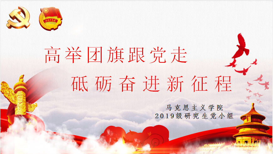 五月的蓓蕾,绽放在青春的枝头;五月的春风,吹拂着年轻的脸庞。为庆祝中国共产党成立100周年,纪念五四运动102周年,教育引导广大党员、团员青年弘扬五四精神、传承红色基因。2021年5月7日,2019级硕士党小组与2019级、2020级团支部联合开展了“高举团旗跟党走、砥砺奋进新征程”弘扬五四精神专题学习,会议由2019级团支部宣传委员王雨洁主持。