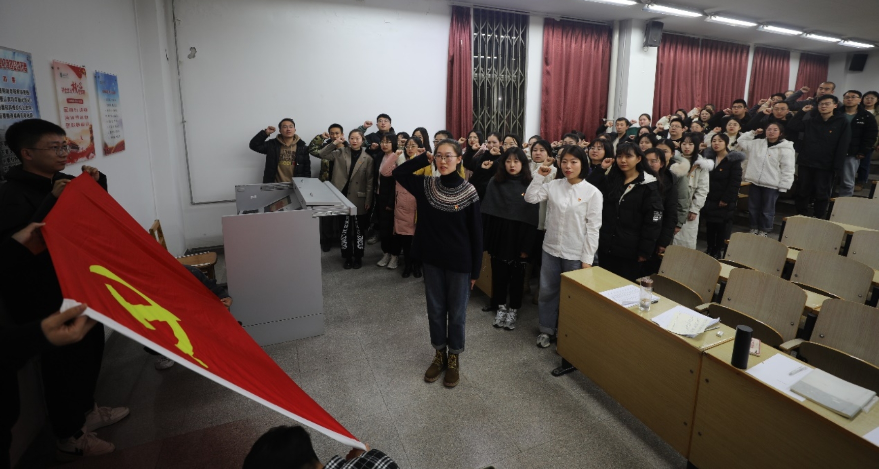 会议最后,新党员同志佩戴党员徽章并面向党旗作出庄严宣誓。