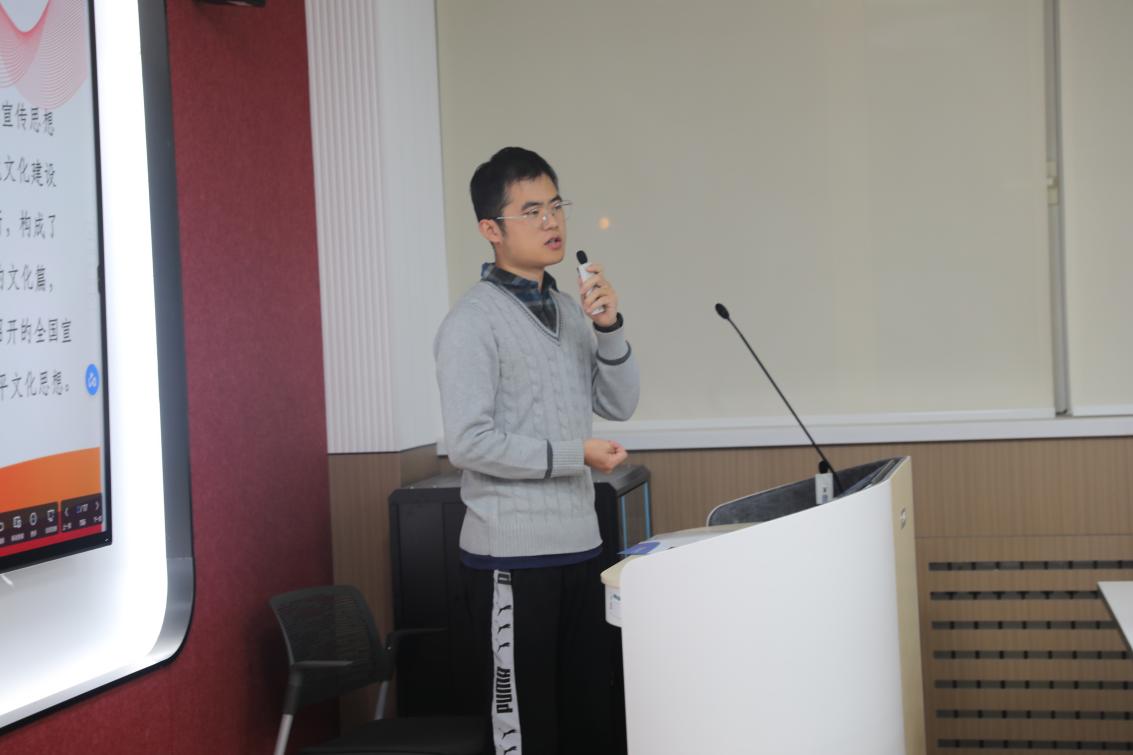 宣讲团副团长王思扬同学进行领学。王思扬首先对习近平文化思想的重要意义进行了解读。习近平文化思想,是新时代党领导文化建设实践经验的理论总结,是对马克思主义文化理论的丰富和发展,是习近平新时代中国特色社会主义思想的文化篇。习近平文化思想的形成,标志着我们党对中国特色社会主义文化建设规律的认识达到了新高度,表明我们党的历史自信、文化自信达到了新高度。随后,他从习近平总书记关于坚持党的文化领导权的重要论述、关于推动物质文明和精神文明协调发展的重要论述、关于“两个结合”的根本要求的重要论述、关于新的文化使命的重要论述、关于坚定文化自信的重要论述、关于培育和践行社会主义核心价值观的重要论述、关于掌握信息化条件下舆论主导权、广泛凝聚社会共识的重要论述等方面对习近平文化思想的丰富内涵进行了领学。他动员同学们要深学原文原著,细悟精髓要义,坚持笃行实干,最后,王思扬向同学们分享了作为马克思主义理论专业的员工,学习和实践习近平文化思想的经验:。