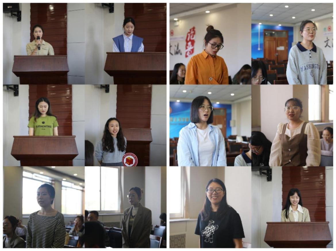 新一届届研究生会主席许馨元、青协主席张怡帆、研究生宣讲团团长邢云婕依次进行发言,其他新骨干成员也先后进行了发言,表达了不断提升工作能力,更好地服务全院师生的决心和信心。