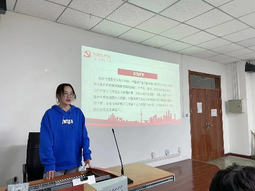 汇报会以小组展示的形式进行,八位小组代表就小组学习情况、学习成果进行汇报,并围绕“伟大建党精神”“党员的权利义务与人物案例解读”“马克思主义基本原理与中华民族传统文化相结合”“从入党誓词的变与不变看中国共产党人的初心和使命”“榜样如星火,照亮新征程——榜样6”“抗美援朝精神”等主题进行了展示,观点明确,形式丰富,层次清晰。党支部副书记冯嘉骐从汇报的内容和形式等方面对各组提出了建议。