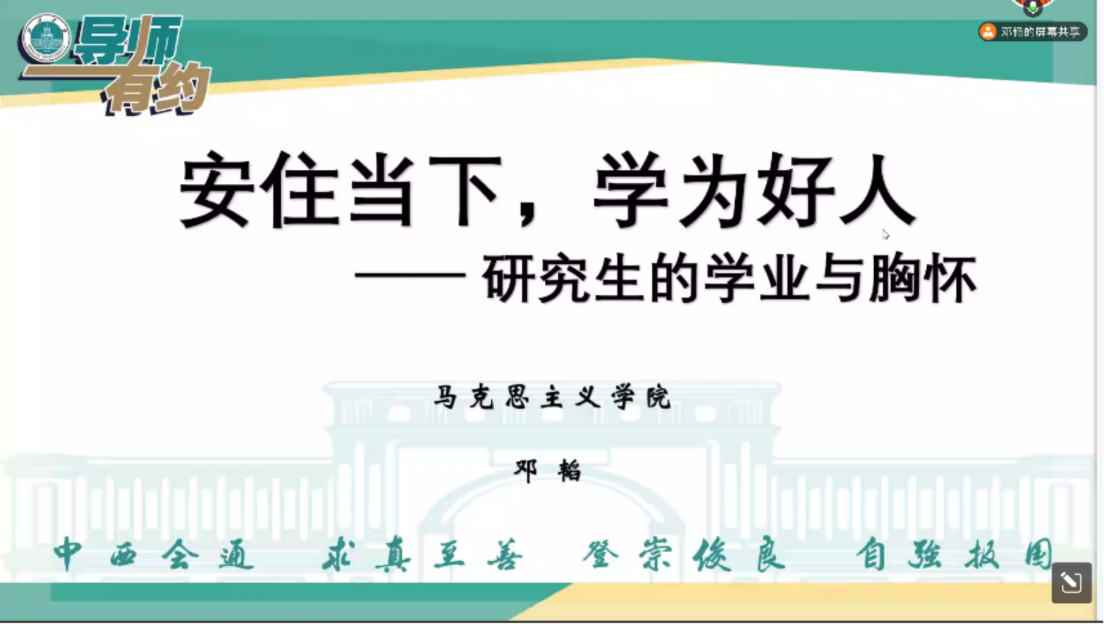 7月5日,乐天使“导师有约——师生携手,共话成长”第九期活动在线上举行,邓韬老师以“安住当下,学为好人——研究生的学业与胸怀”为题与研究生展开交流,共同探讨研究生应具备的能力与胸怀。