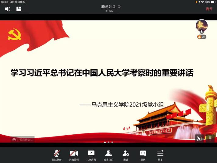 4月25日,在五四青年节到来之际,习近平总书记赴中国人民大学考察调研并发表重要讲话。4月28日,乐天使研究生党支部以党小组为单位组织开展线上专题学习会,深入学习习近平总书记在中国人民大学考察时的重要讲话精神。