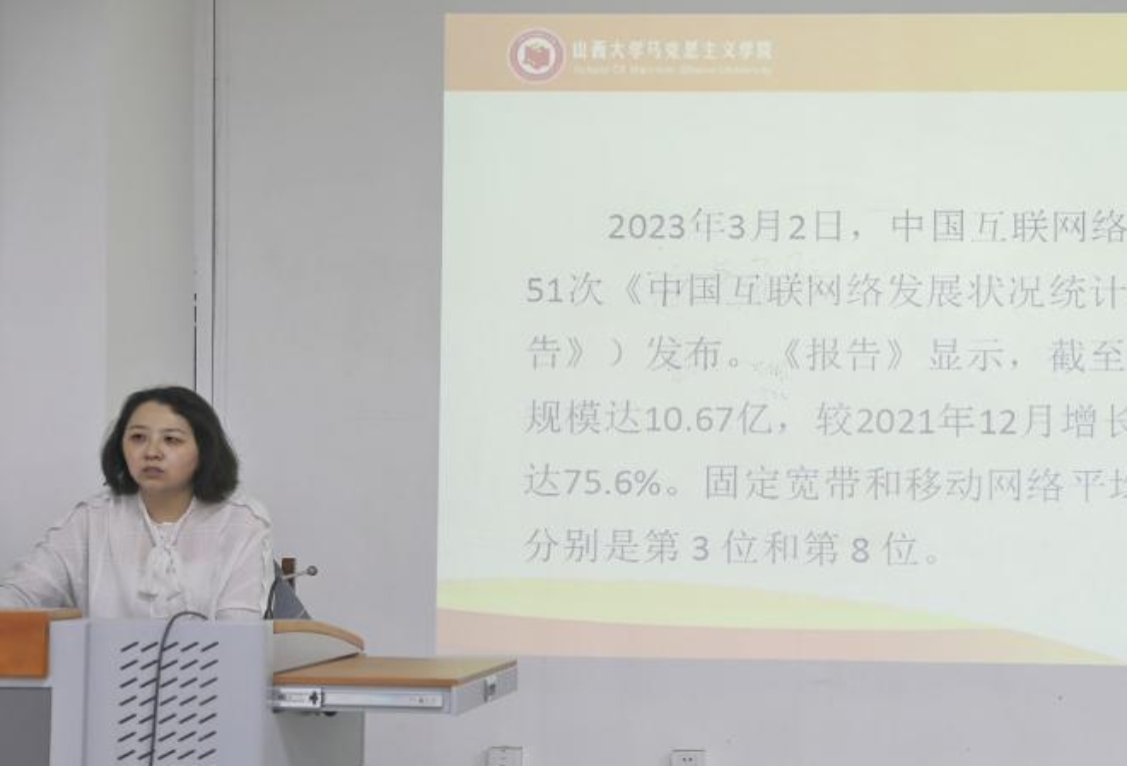 逯慧老师指出,庞大的网络参与群体和多元化的上网终端设备,使网络成为社会发展的重要引擎,但也带来了众多负面影响。面对网络带来的挑战,网络思政教育有别于传统思政教育,对人们的理想信仰和奋斗目标有着重要的导向作用,同时也承担着育人的责任。她基于网络思政研究范式与传统思政教育研究的差异,立足交叉学科研究,建议大家将网络亚文化与思政工作相结合,重点关注网络话语权的构建、私人教育碎片化以及意识形态管理等问题,以更好更深研究网络思政研究的内容。最后,逯老师通过举“弹幕”这一新兴文艺评论工具对思政教育的发展,指出科技发展既给思政教育带来良好的机遇,又使思政教育面临严峻的挑战,希望同学们要努力抢抓机遇,积极应对挑战,正确把握舆论导向,努力提高自身的政治素养。
