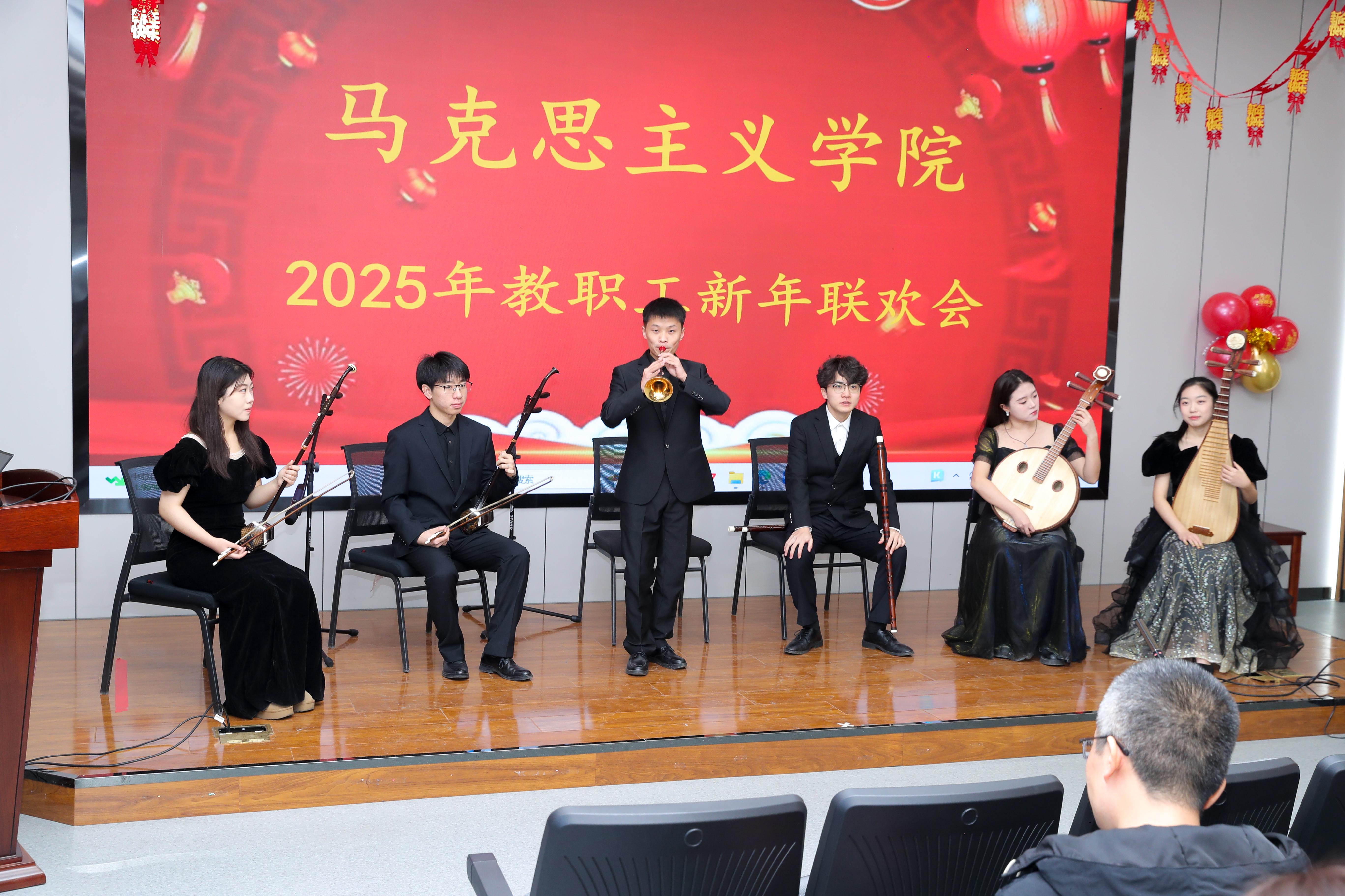 整场联欢会氛围热烈,笑声与掌声此起彼伏。教师第五党支部的配乐诗朗诵《我骄傲,我的中国》用热情激昂的声音歌颂着新时代思政课教师对祖国伟大变迁的自信认同。教师第三党支部带来的诗朗诵《在马克思主义旗帜下》用气势磅礴的声音抒发着新时代思政课教师“在马言马”的壮志情怀。教师第二党支部的集体舞蹈《苹果香》用生动活泼的舞姿展现出新时代思政课教师“孜孜以求”的教师形象。教师第一党支部“方言版”的《再别康桥》诗朗诵以欢快的表达方式反映了新时代思政课教师“积极向上”的精神风采。教师第四党支部的小提琴伴奏诗朗诵《强国有我》诠释了新时代思政课教师为党育人、为国育才的坚强决心。老师们演唱的歌曲串烧《人间》、《我的未来不是梦》、《等待》、《奢香夫人》点燃了现场的气氛。