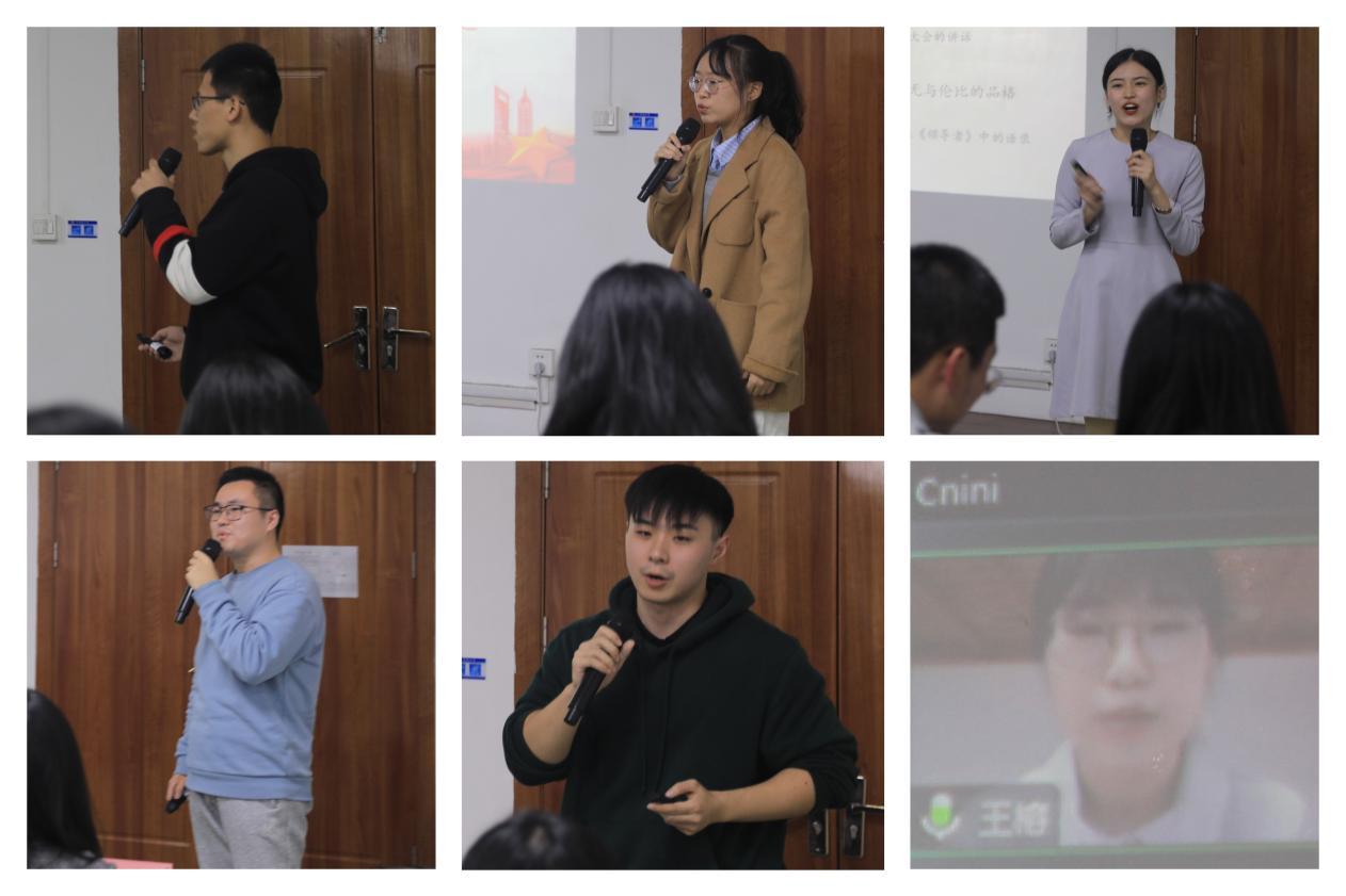 本次比赛共有18名同学参赛,选手们根据赛前的抽签顺序,分六个小组依次进行演讲。选手们选题内容丰富,角度新颖,申思淼同学的《思政之“盐”融入课程之“汤”》、康佳同学的《周恩来精神对新时代青年的价值探析》、王思扬同学的《马克思对鲍威尔政治解放的批判与超越》、杨梦珍同学的《马克思,靠谱!》、刘宇轩同学的《马克思主义永葆生机活力的奥秘》、张泽琨同学的《国共第一次合作的思想基础》、程紫薇同学的《警惕“黑天鹅”,防范“灰犀牛”》、侯文潇同学的《实践是检验真理的唯一标准》、刘昶同学的《马克思学说的整体性解读——基于异化劳动概念》、申康凯同学的《从<欧也妮·葛朗台>中解读当时西方社会的异化现象》等,都给大家留下了深刻的印象。选手们演讲思路清晰,分析视角新颖,把马克思主义理论与社会热点、现实实践有机结合了起来,现场掌声不断。