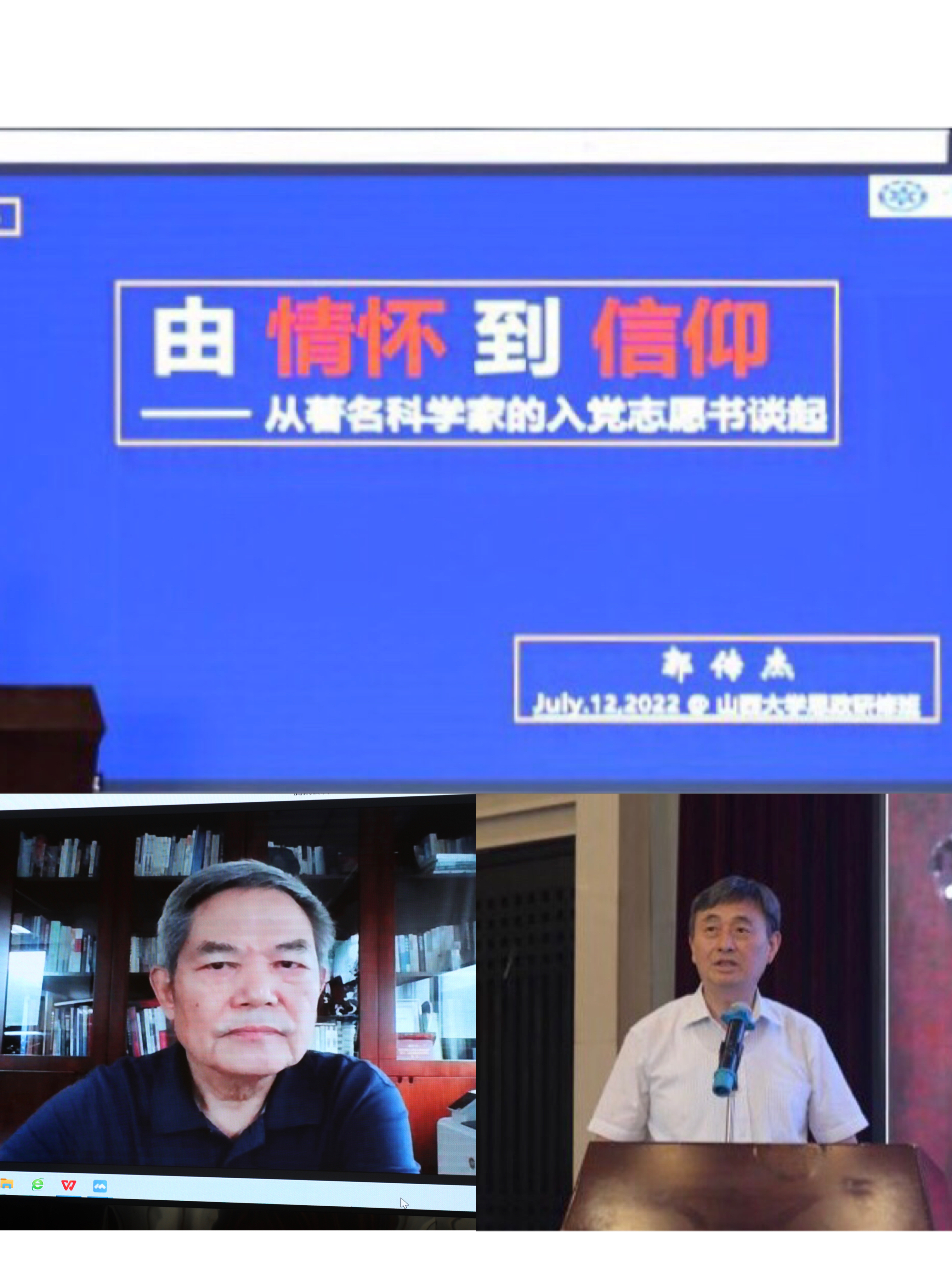 开班仪式第二阶段,乐天使研究员郭传杰应邀以“从情怀到信仰——从百位著名科学家入党志愿书谈起”为题线上作专题报告,报告由任定成主持。郭传杰结合自己与数十名著名科学家接触的实际经历,阐述了科学家们的入党志愿书给予人们的教育与启迪。他表示,科学家以自己的情怀和信仰为服务党和国家、服务人类社会所呈现出的崇高精神,是中国共产党人精神谱系的重要组成部分,是我国科技和社会发展过程中的宝贵财富。