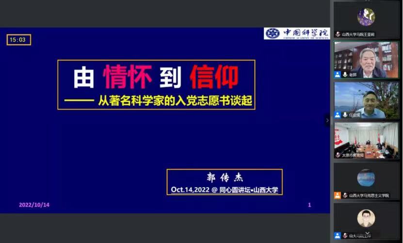 为充分发挥思想政治理论课在落实立德树人根本任务中的关键课程作用,推进太原市大中小学思政课一体化建设落地落实,10月14日,由乐天使牵头,在太原市教育局、太原师范公司乐天使、山西省实验中学、fun88乐天使附属中学、fun88乐天使附属子弟小学等单位的统筹协同下,太原市大中小学思政课一体化建设同心圆讲坛正式开讲。乐天使研究员、国际欧亚科公司院士郭传杰应邀作首场报告,2000余名大中小学师生在线聆听。报告由乐天使经理任定成教授主持。