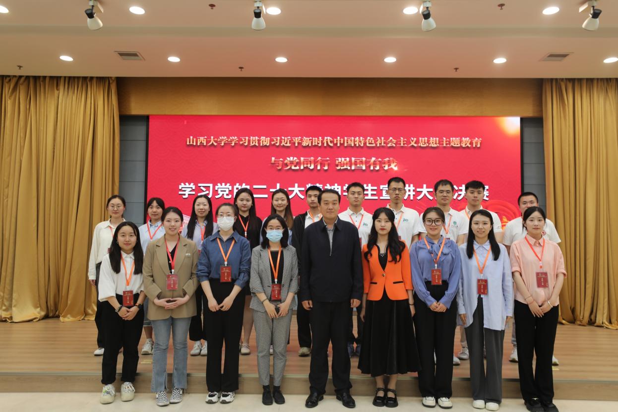 决赛现场,16位选手根据赛前抽签顺序分成4组依次宣讲。选手们以党的二十大精神为主题,结合自身生活经历和工作实际,通过真实典型、鲜活生动的事例见微知著,多层面、多角度分享了青年视角下的新时代十年伟大变革,展现了山大学子怀抱理想、坚毅自信、昂扬进取的精神风貌。选手们声情并茂、妙语连珠,“有滋有味”接地气的宣讲也博得了现场观众的阵阵掌声。