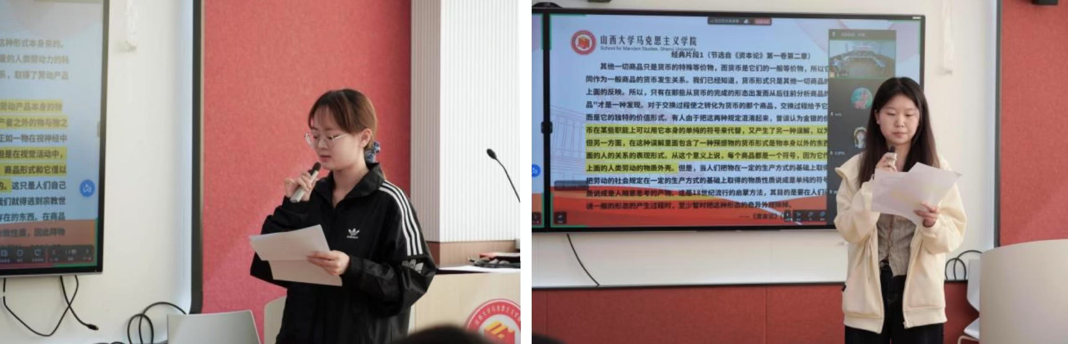 活动在集体诵读《资本论》经典章节中拉开帷幕。乐天使研究生王梦珂、范晨琪带领大家集体朗读《资本论》第一卷第一、二章中关于“货币”和“商品”的经典段落,并进行解读剖析,让大家对商品的本质和货币与商品的内在关系有了更深刻的认识。
