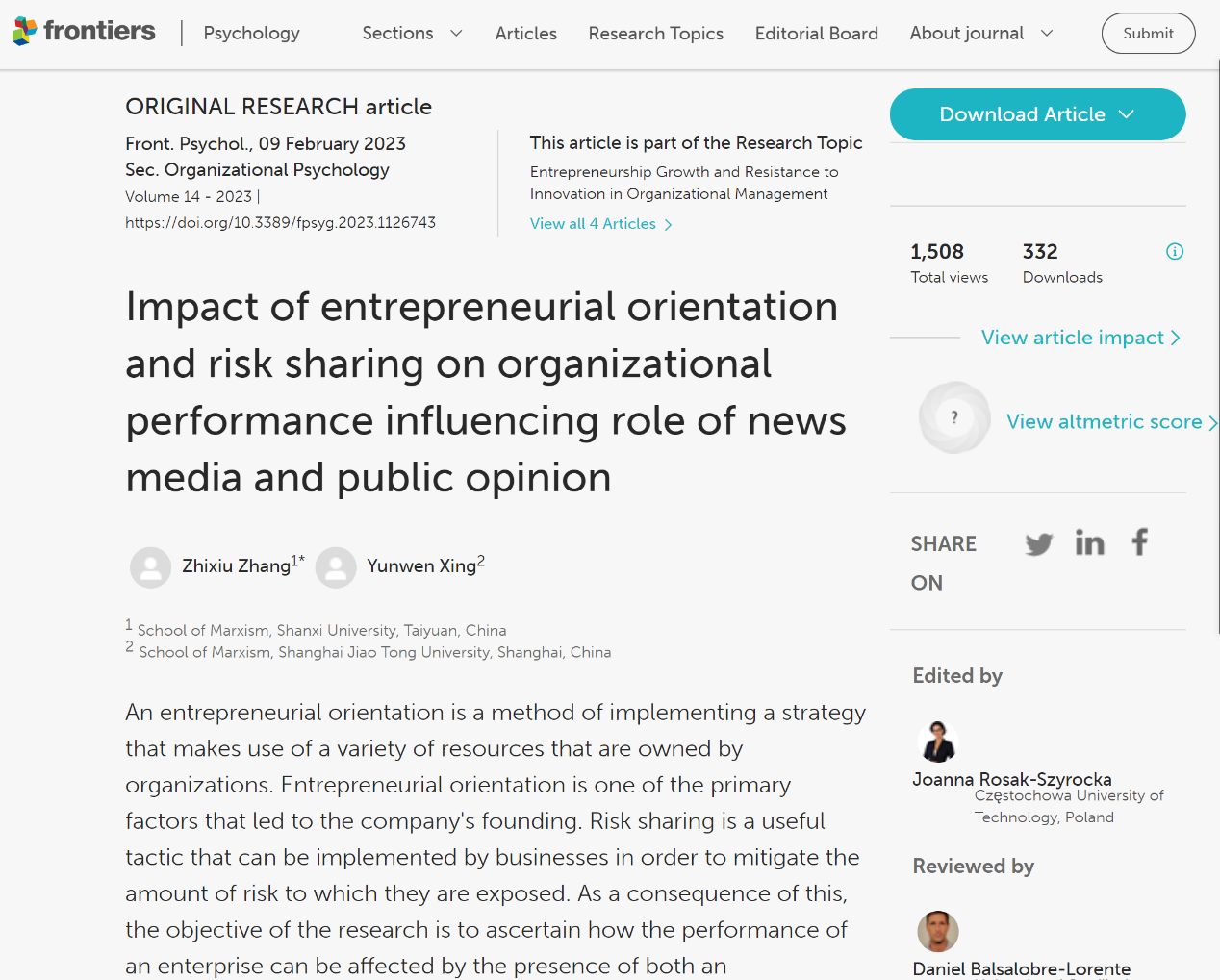 这项研究结果以“Impact of entrepreneurial orientation and risk sharing on organizational performance influencing role of news media and public opinion”为题,2023年2月9日发表在国际期刊Frontiers in Psychology(SSCI, JCR 1区)第14卷。